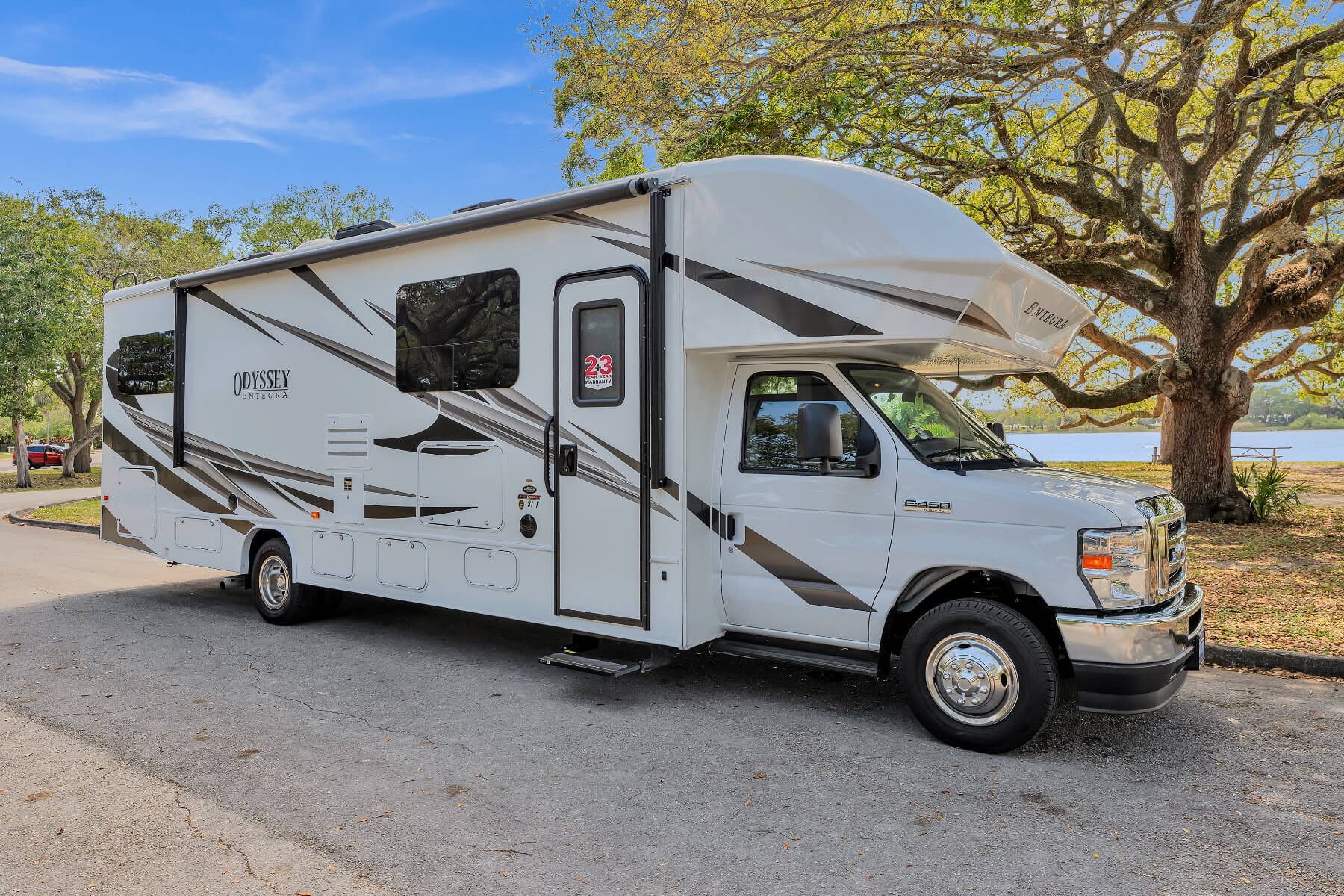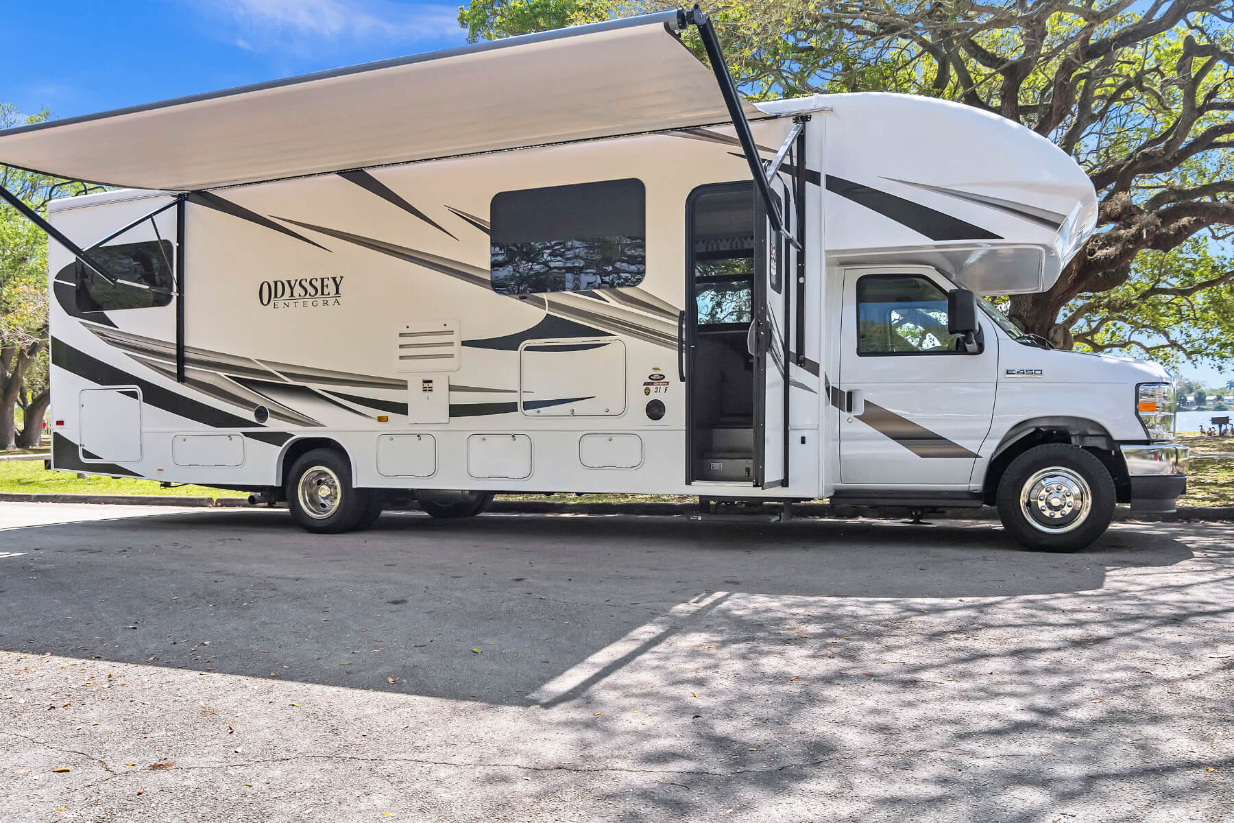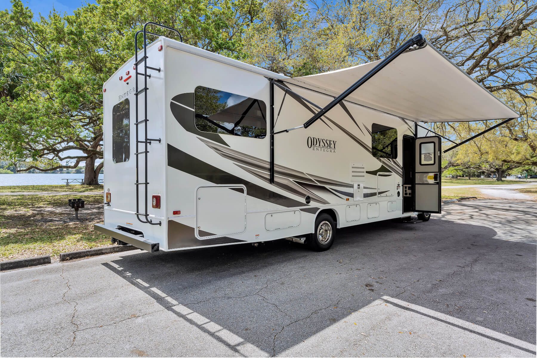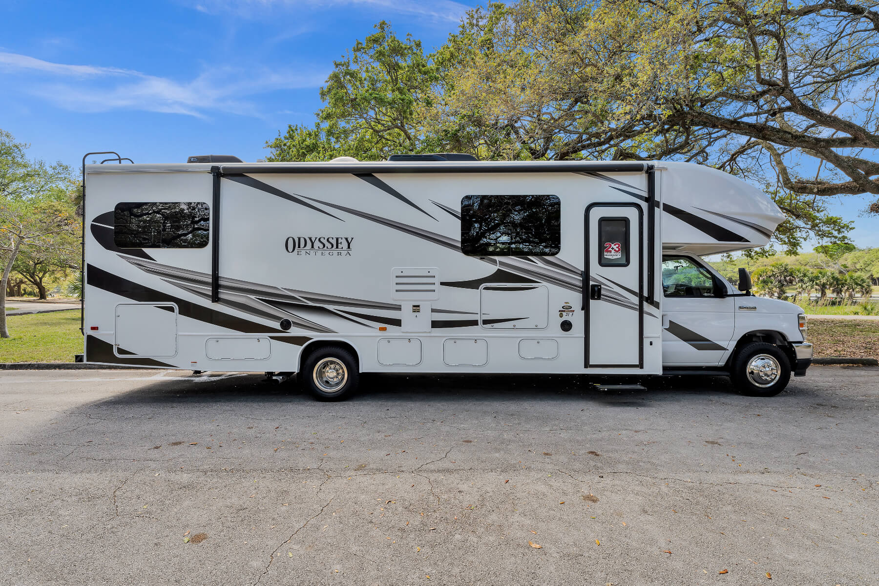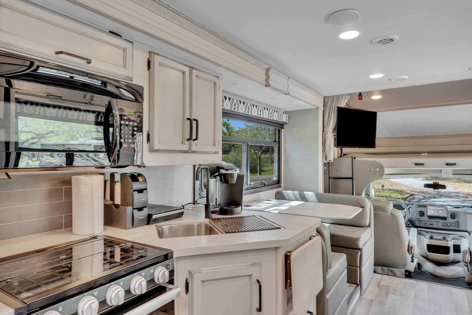 With any Odyssey Class C gas motorhome by Entegra Coach, the driver will appreciate the power from the 350 HP engine, the towing capacity from the 7,500 lb. hitch, the Tire Pressure Monitoring system, the navigation from the Sony infotainment center with Apple CarPlay and Android Auto, plus the backup and side-view cameras when parking and driving down the highway. The kitchen offers full amenities including a recessed stainless steel sink with a cutting board sink cover, LED-lite pressed countertops, a decorative backsplash, and a pop-up charging station with 110 outlet and USB plugs to keep your smart phones charged. Get ready for luxury in a Class C!
