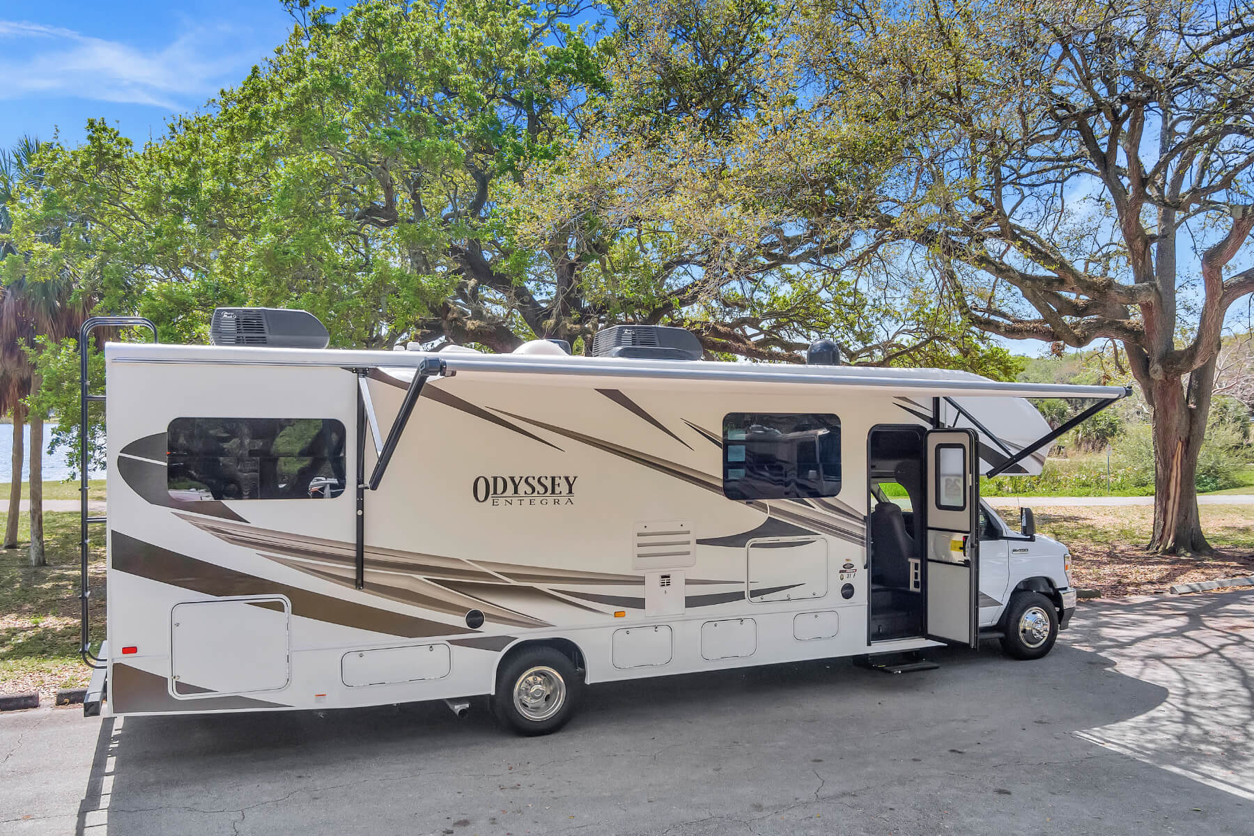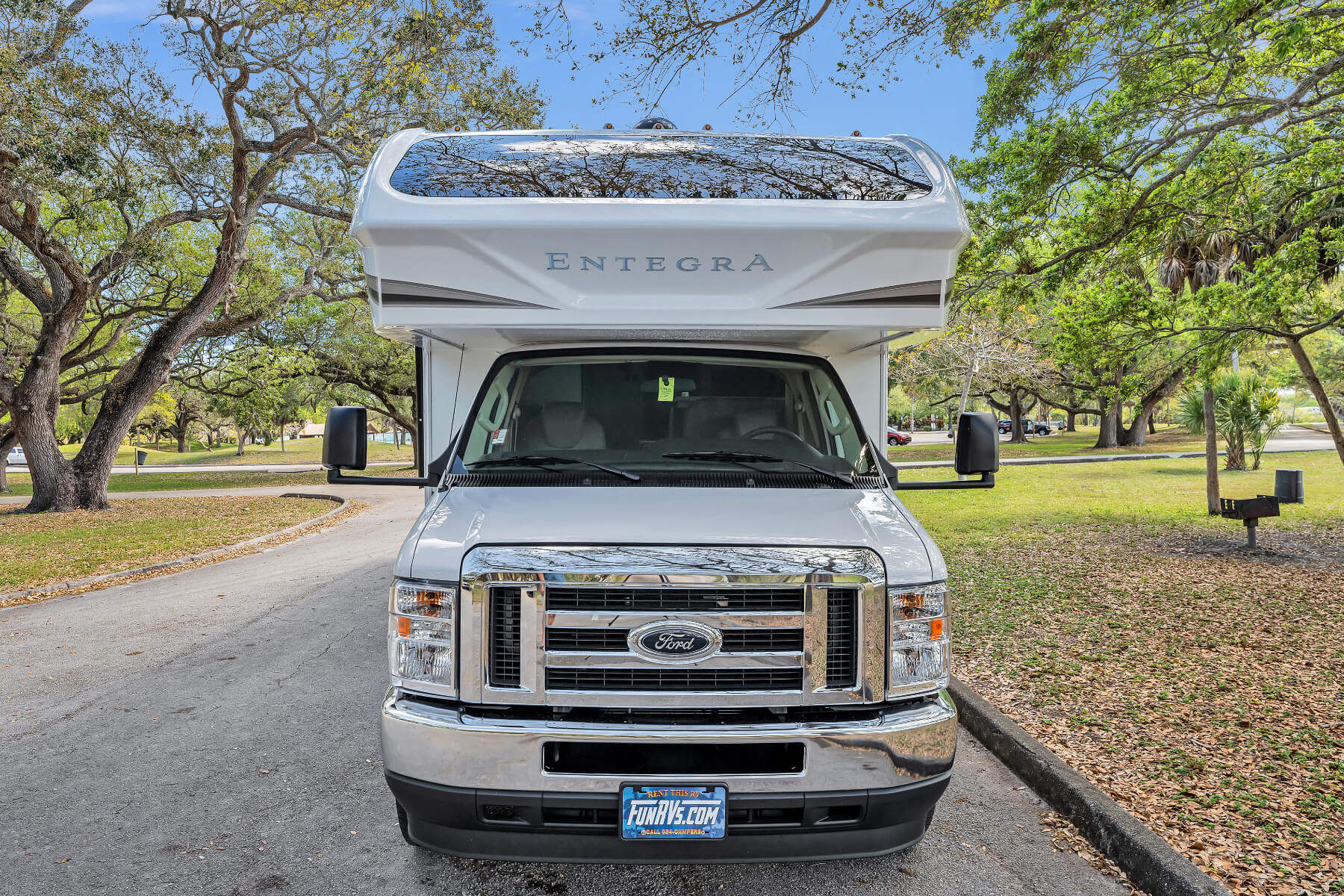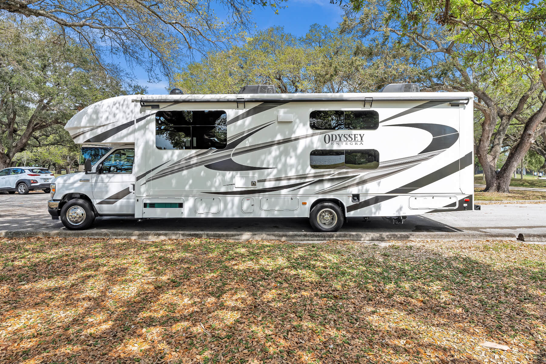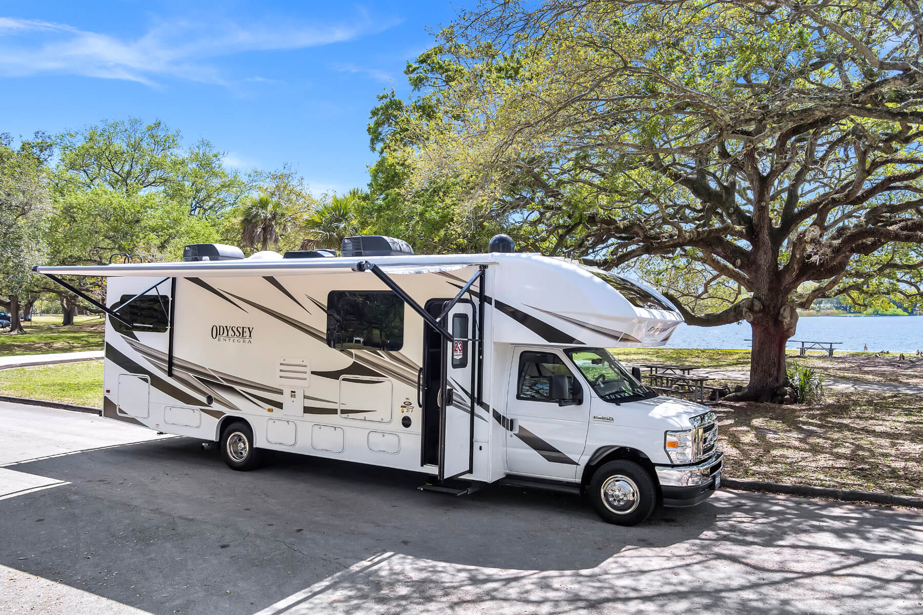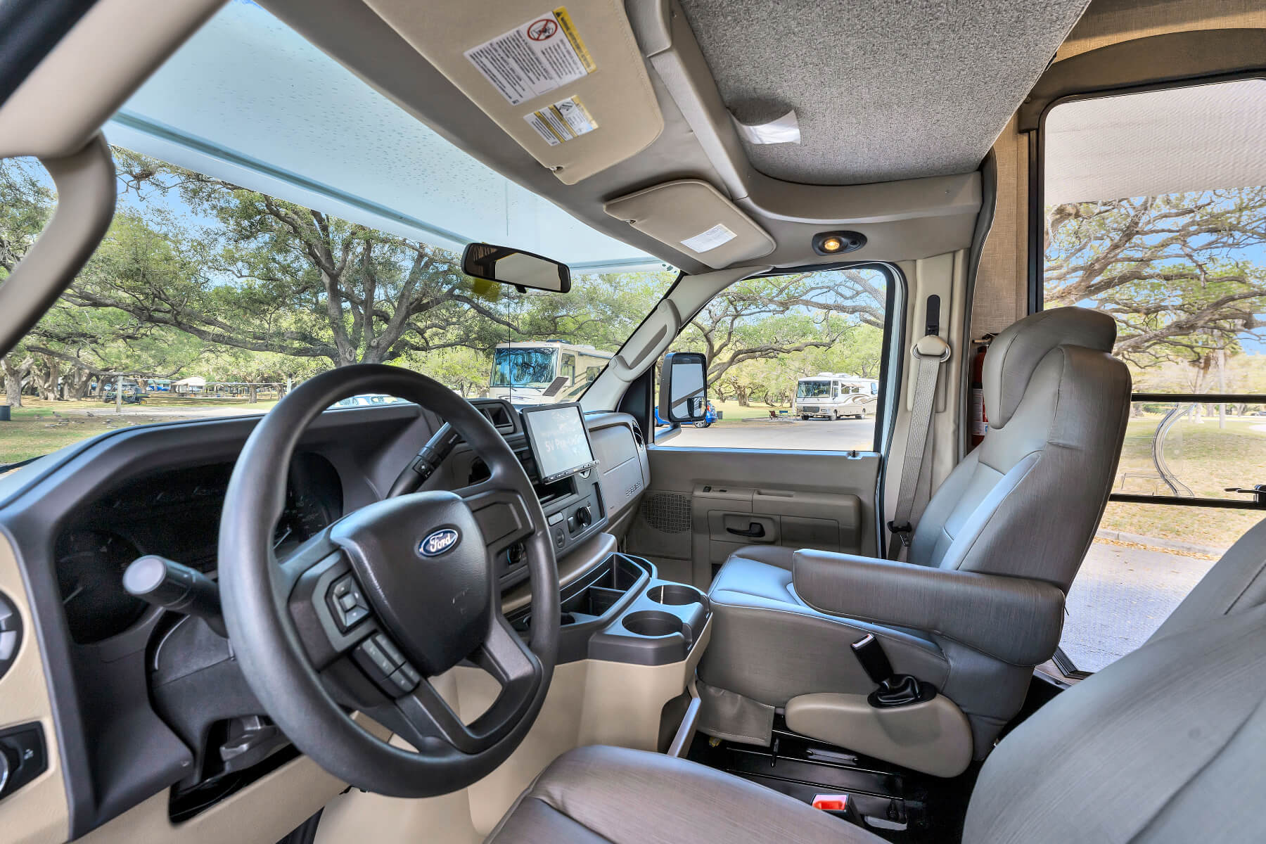 With any Odyssey Class C gas motorhome by Entegra Coach, the driver will appreciate the power from the 350 HP engine, the towing capacity from the 7,500 lb. hitch, the Tire Pressure Monitoring system, the navigation from the Sony infotainment center with Apple CarPlay and Android Auto, plus the backup and side-view cameras when parking and driving down the highway. The kitchen offers full amenities including a recessed stainless steel sink with a cutting board sink cover, LED-lite pressed countertops, a decorative backsplash, and a pop-up charging station with 110 outlet and USB plugs to keep your smart phones charged. Get ready for luxury in a Class C!