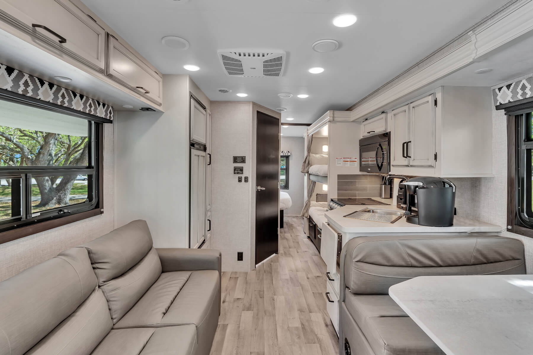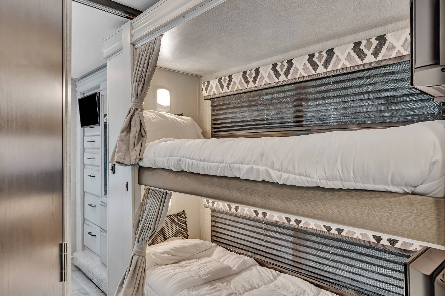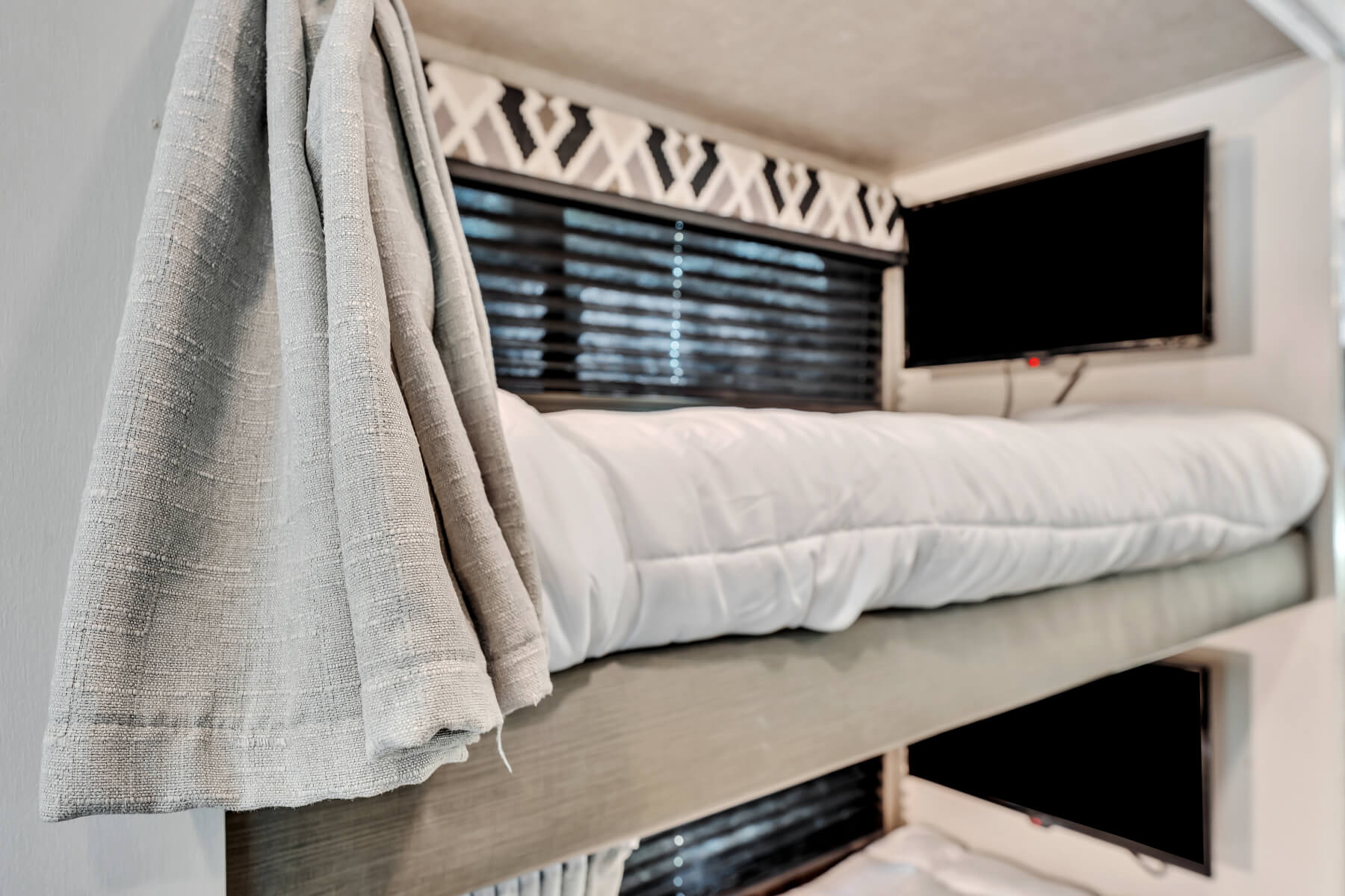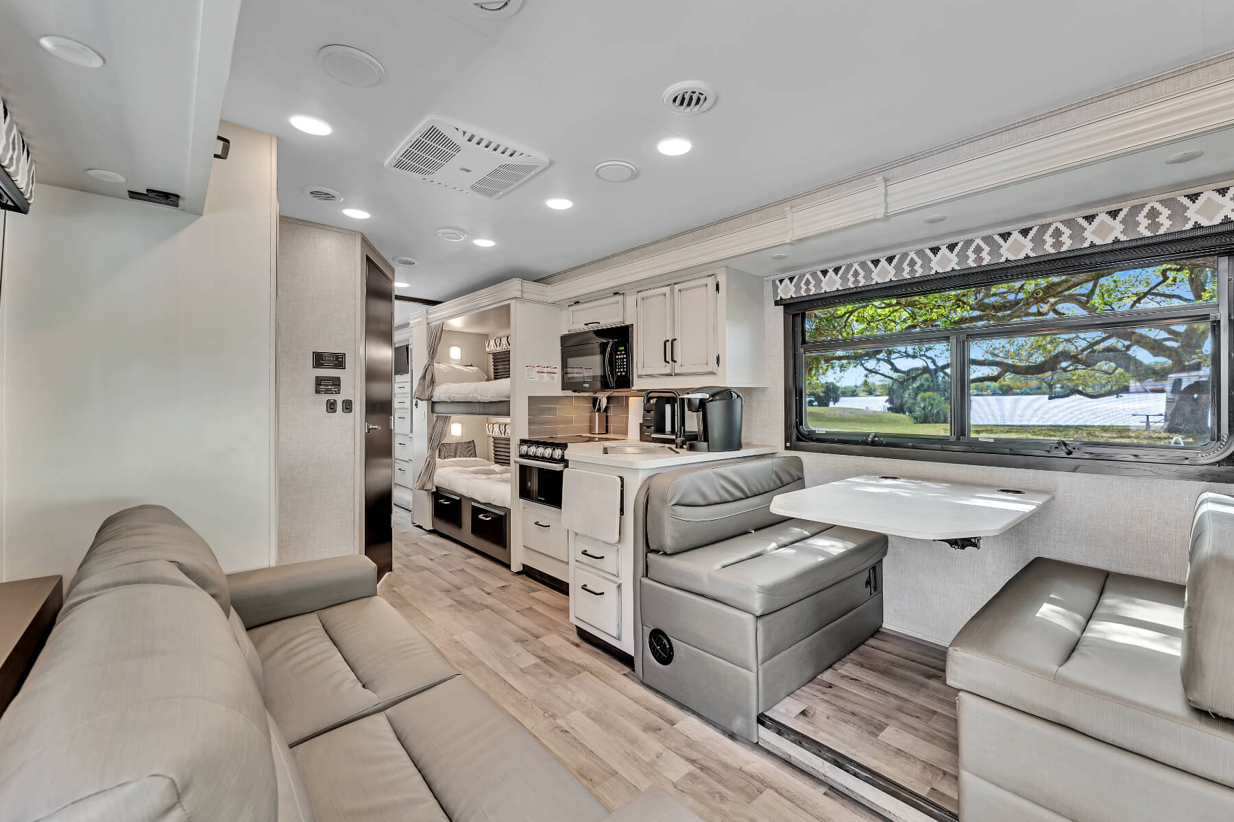Gather your family and load up for travel games, camping games and all around comfort and luxury! The full-wall slide provides extra floor space from just behind the swivel captains chairs all the way back to the private rear bedroom with a queen bed and clothing storage. The bunk beds are across from the main entry to the bathroom, and your kids or grandkids will love this space as well as the front cab-over bunk. You even have more sleeping space provided by the booth dinette and sofa once easily setup for bedtime. And the cook will have a residential-size microwave, a Furrion all-in-one cooktop and oven, plus an 8 cu. ft. refrigerator to keep everyone fed, and the pantry will hold the snacks. Everyone can also enjoy the 18′ electric awning while at the campsite either day or night thanks to the LED lights, and the exterior TV will allow you to watch the big game in the great outdoors.
