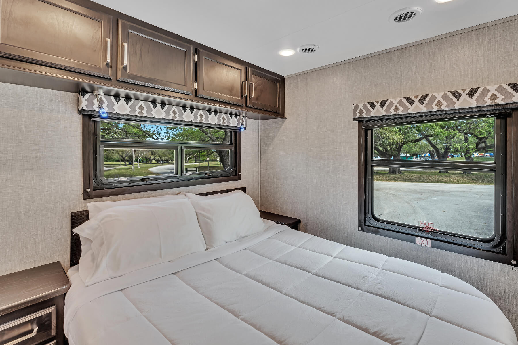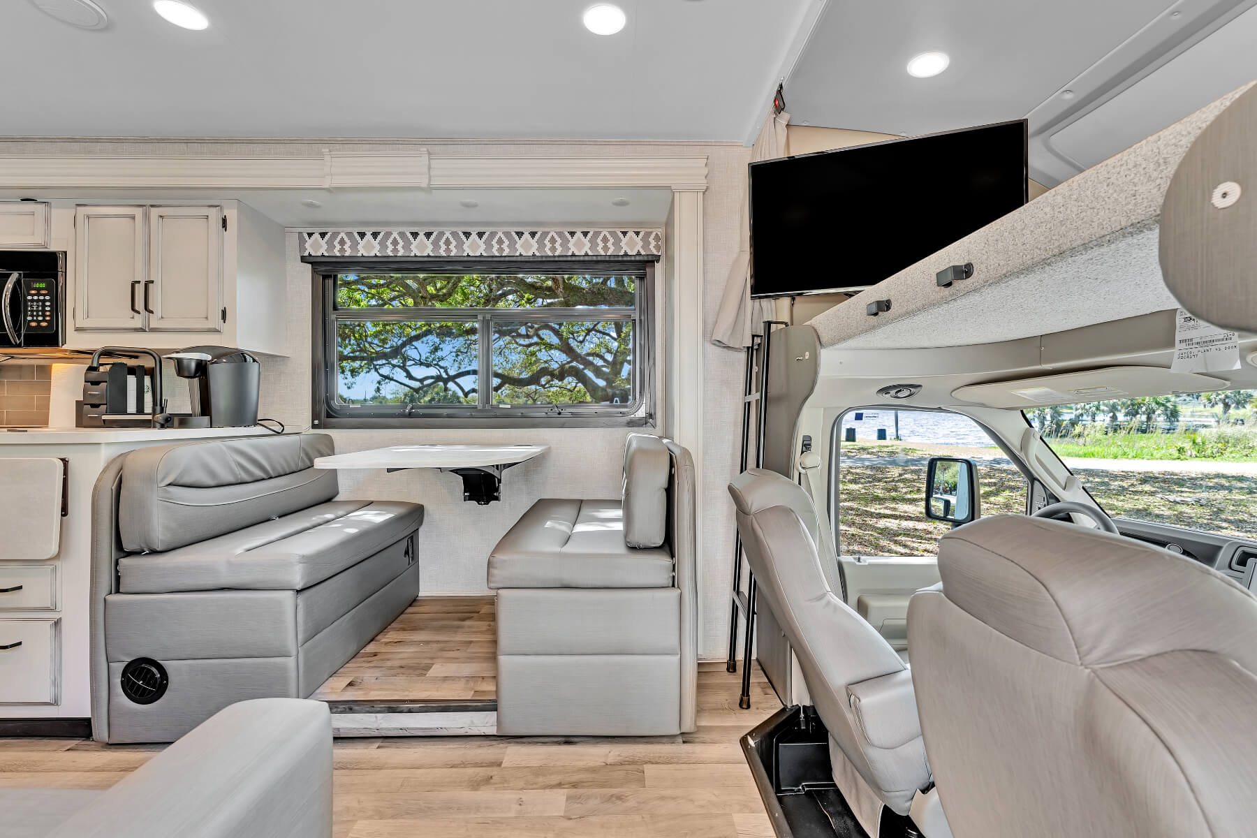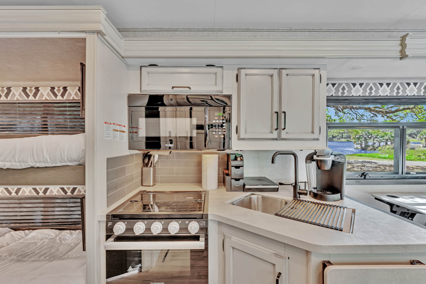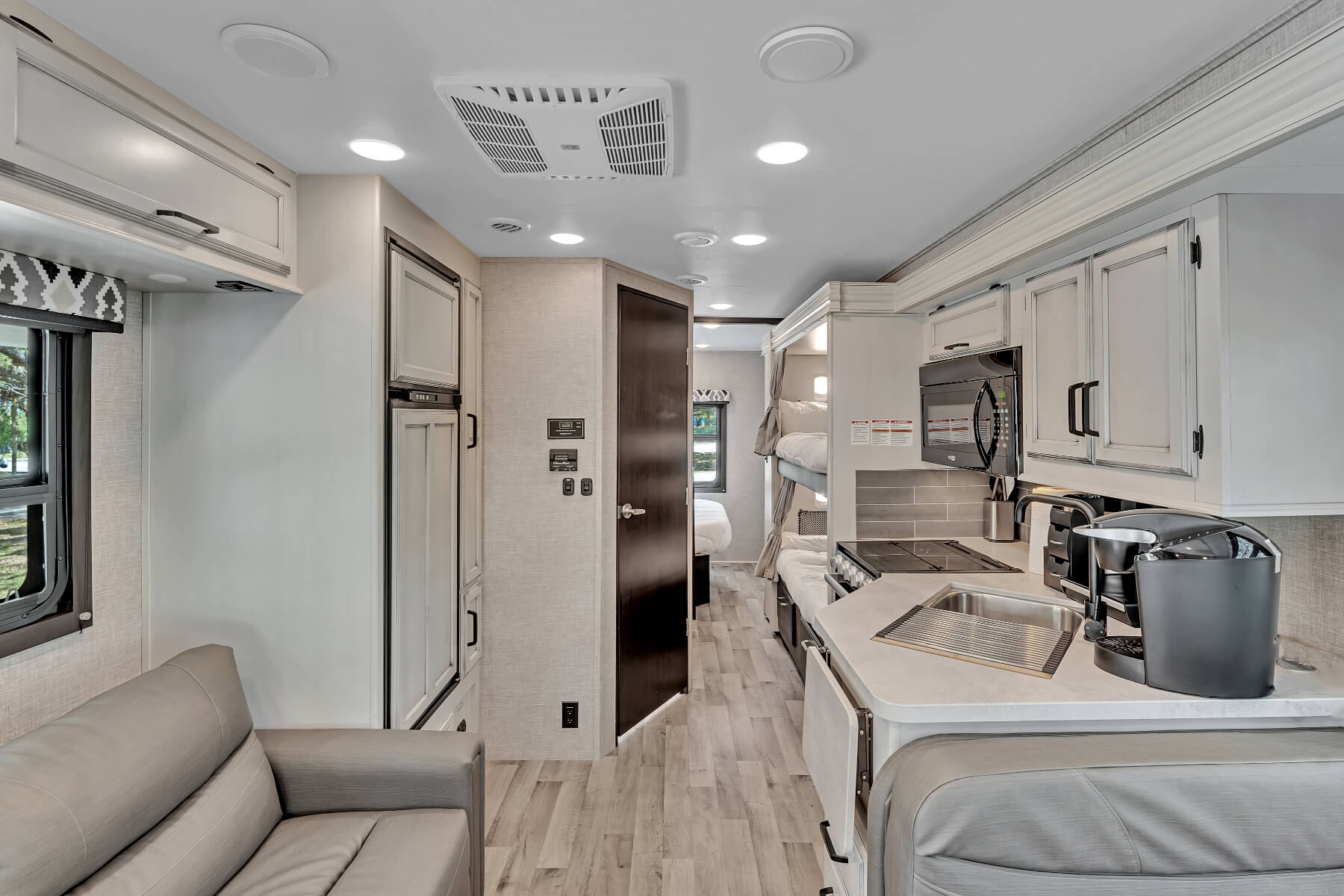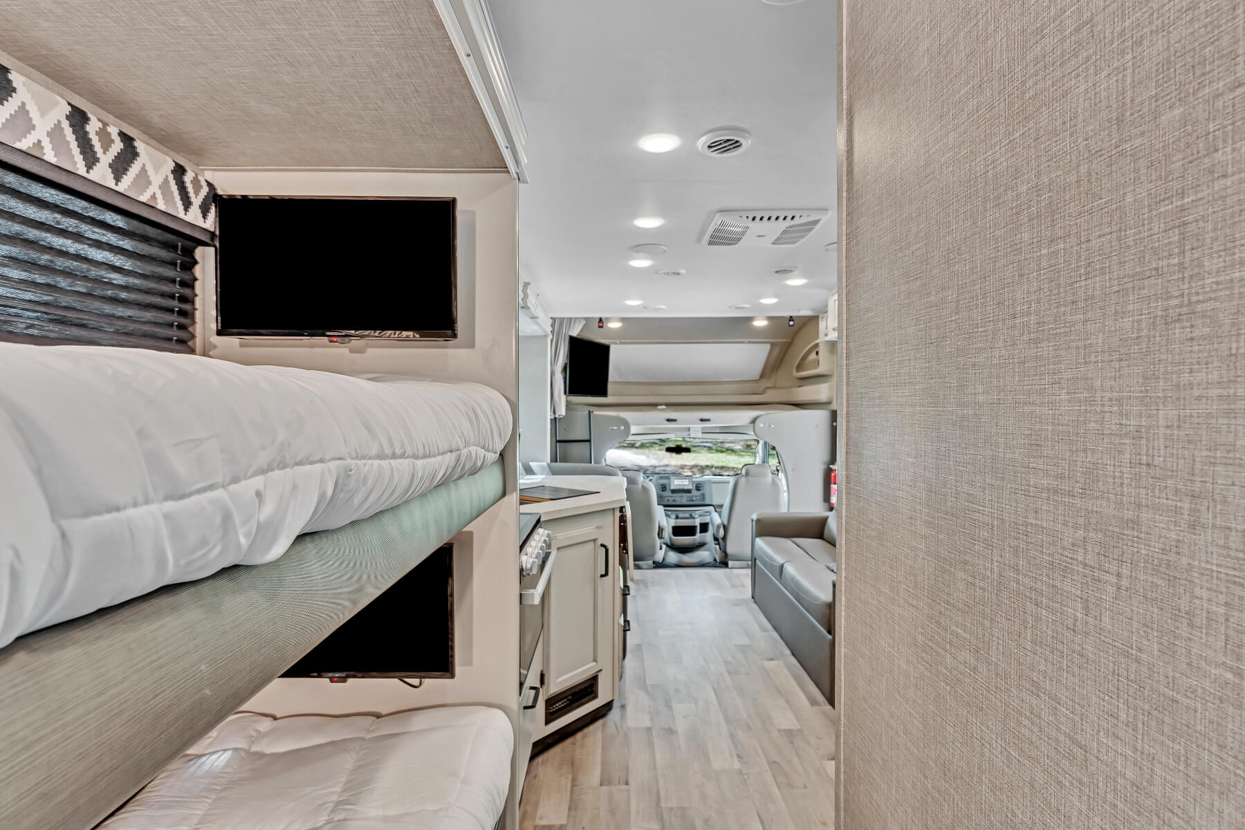 Gather your family and load up for travel games, camping games and all around comfort and luxury! The full-wall slide provides extra floor space from just behind the swivel captains chairs all the way back to the private rear bedroom with a queen bed and clothing storage. The bunk beds are across from the main entry to the bathroom, and your kids or grandkids will love this space as well as the front cab-over bunk. You even have more sleeping space provided by the booth dinette and sofa once easily setup for bedtime. And the cook will have a residential-size microwave, a Furrion all-in-one cooktop and oven, plus an 8 cu. ft. refrigerator to keep everyone fed, and the pantry will hold the snacks. Everyone can also enjoy the 18′ electric awning while at the campsite either day or night thanks to the LED lights, and the exterior TV will allow you to watch the big game in the great outdoors.