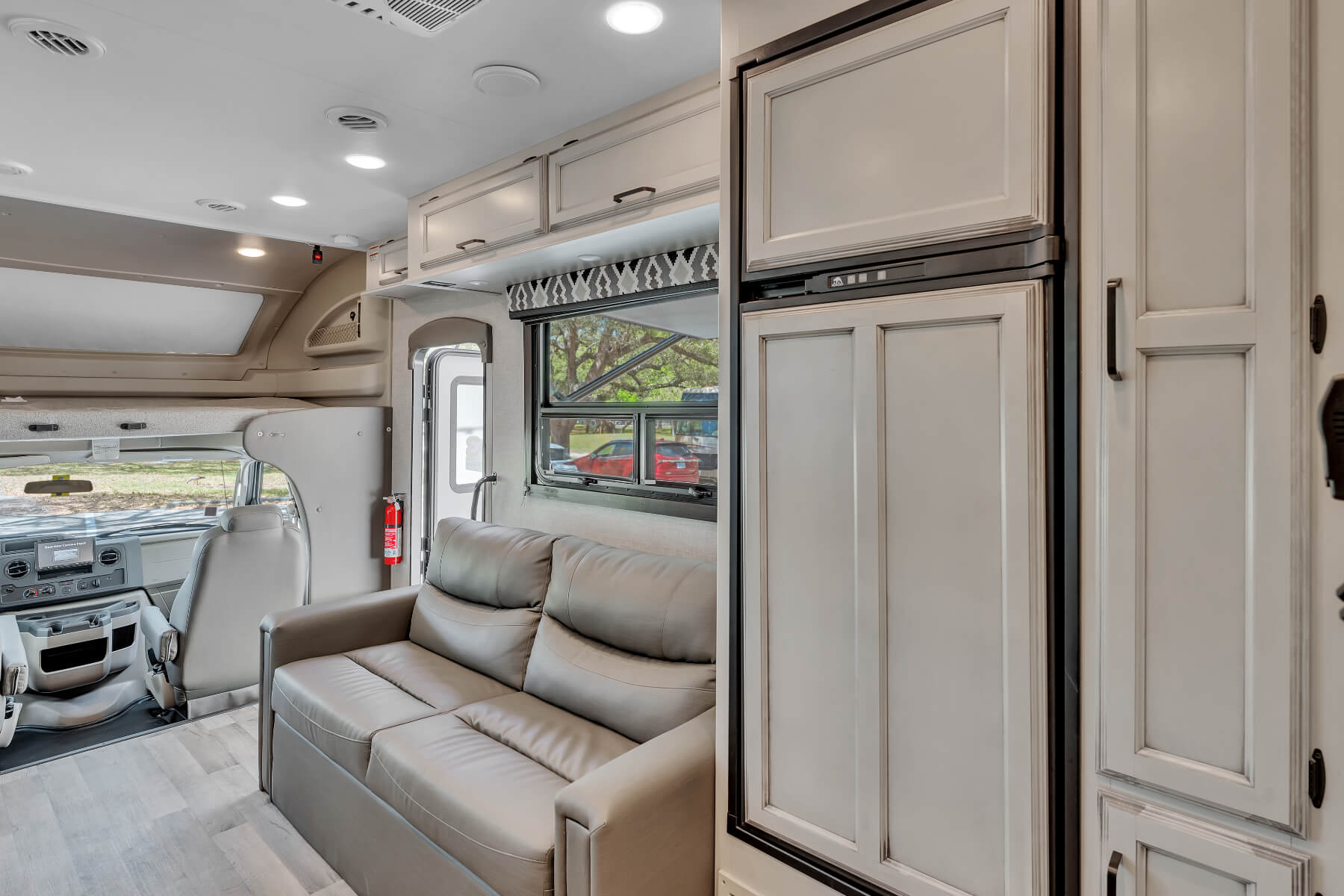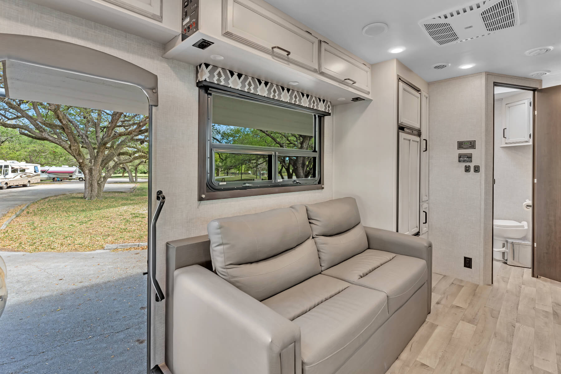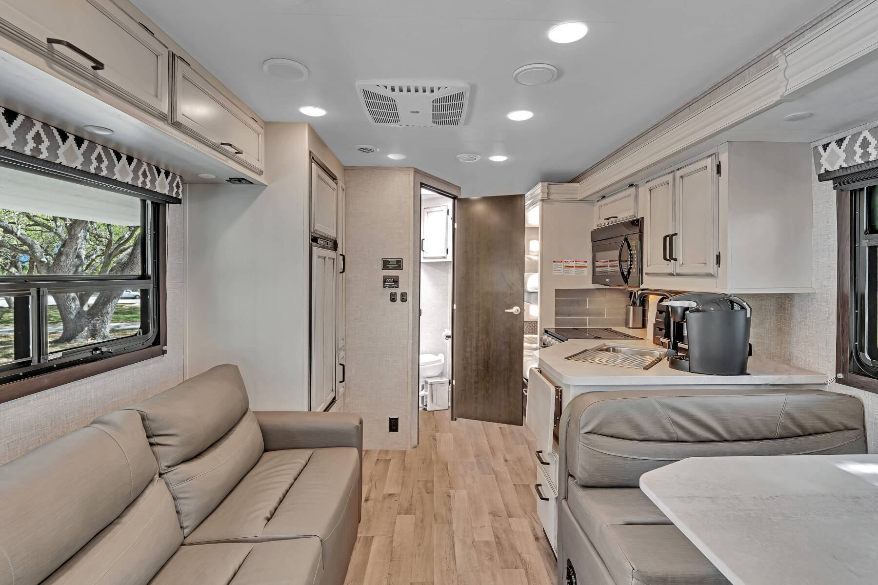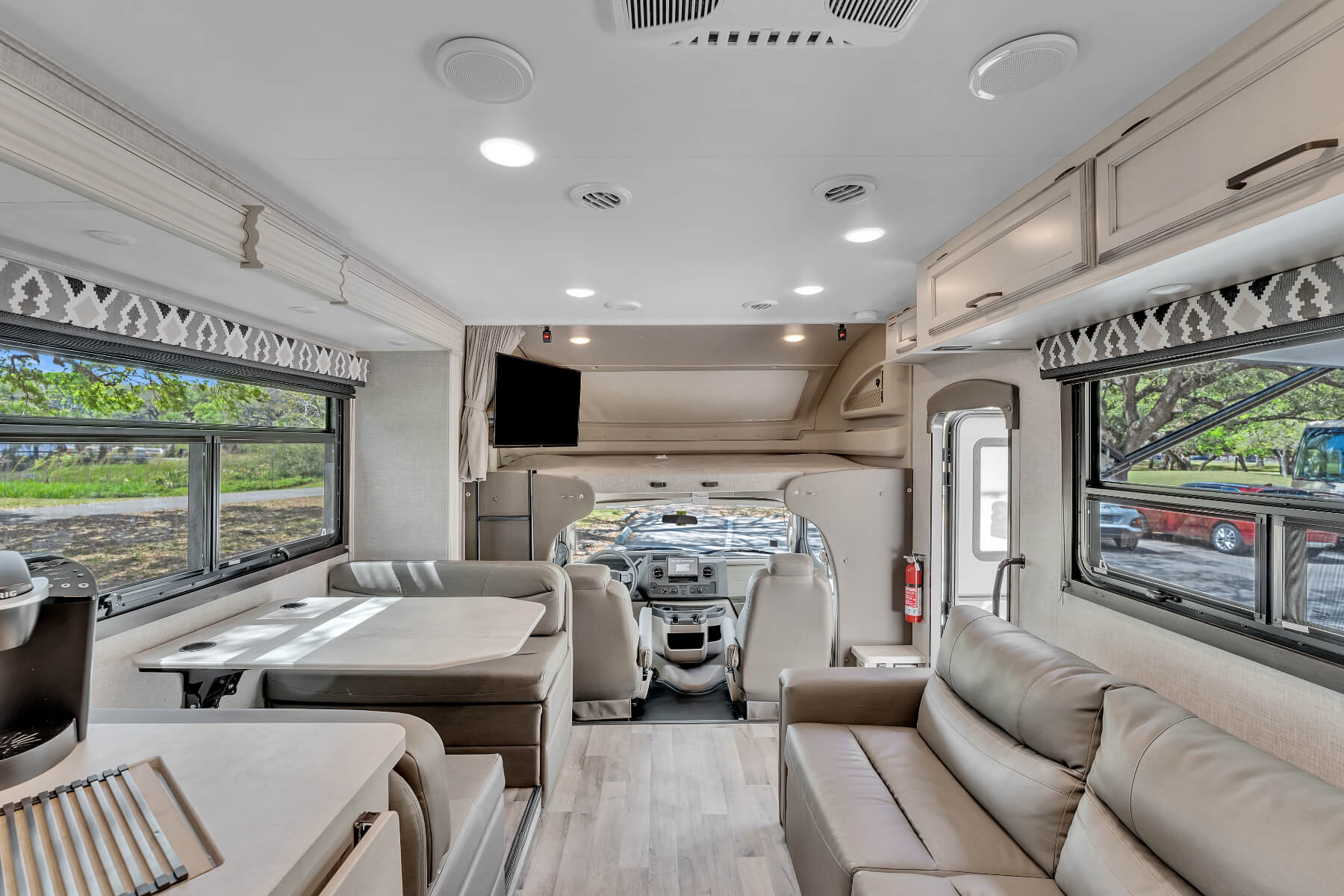 Gather your family and load up for travel games, camping games and all around comfort and luxury! The full-wall slide provides extra floor space from just behind the swivel captains chairs all the way back to the private rear bedroom with a queen bed and clothing storage. The bunk beds are across from the main entry to the bathroom, and your kids or grandkids will love this space as well as the front cab-over bunk. You even have more sleeping space provided by the booth dinette and sofa once easily setup for bedtime. And the cook will have a residential-size microwave, a Furrion all-in-one cooktop and oven, plus an 8 cu. ft. refrigerator to keep everyone fed, and the pantry will hold the snacks. Everyone can also enjoy the 18′ electric awning while at the campsite either day or night thanks to the LED lights, and the exterior TV will allow you to watch the big game in the great outdoors.