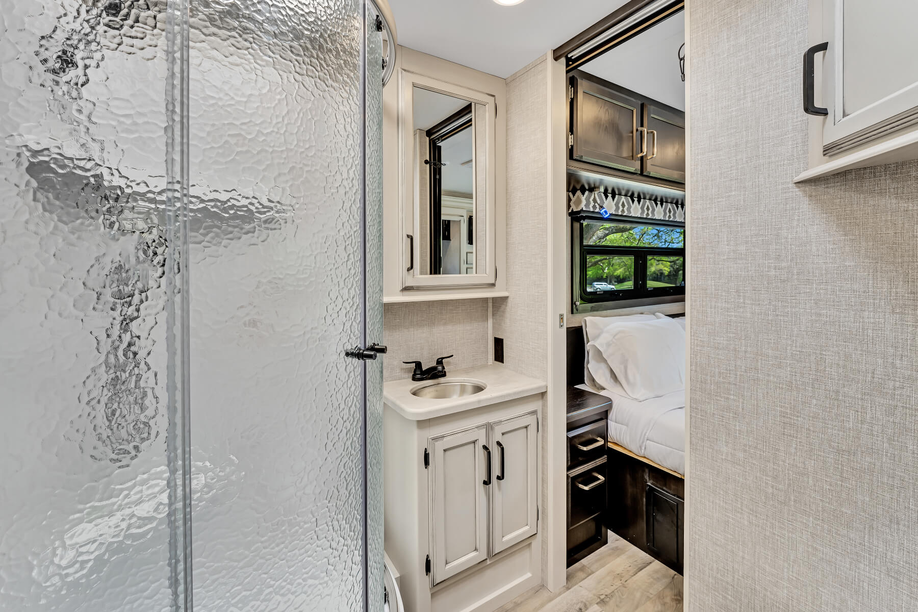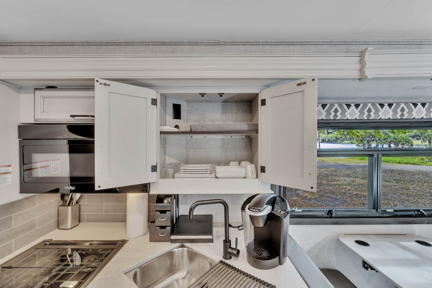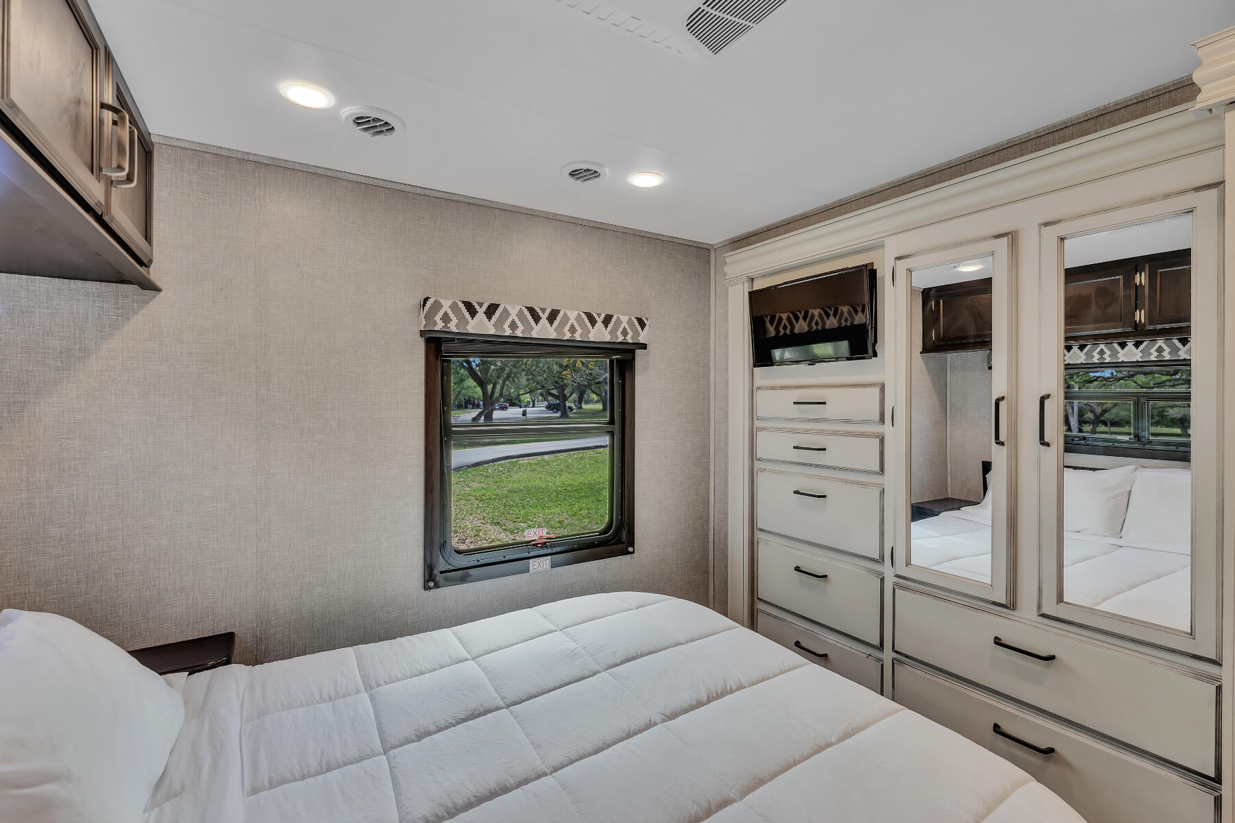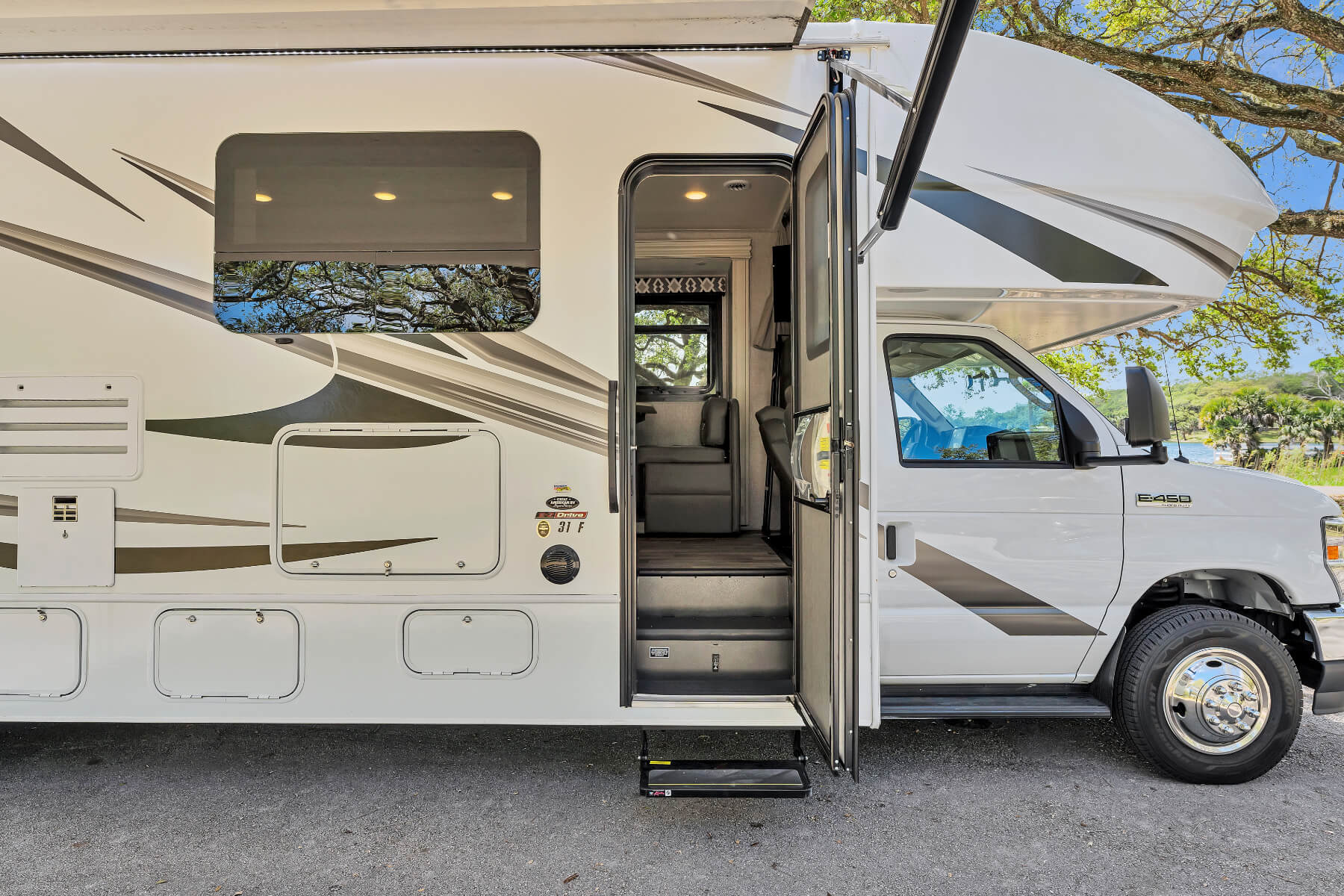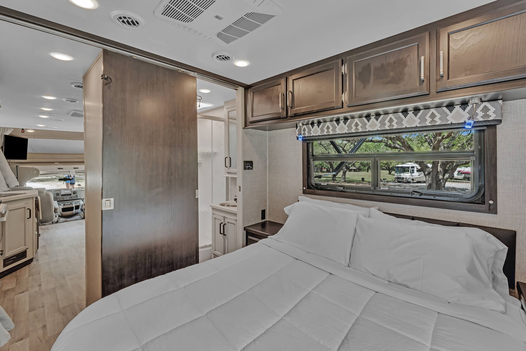 Gather your family and load up for travel games, camping games and all around comfort and luxury! The full-wall slide provides extra floor space from just behind the swivel captains chairs all the way back to the private rear bedroom with a queen bed and clothing storage. The bunk beds are across from the main entry to the bathroom, and your kids or grandkids will love this space as well as the front cab-over bunk. You even have more sleeping space provided by the booth dinette and sofa once easily setup for bedtime. And the cook will have a residential-size microwave, a Furrion all-in-one cooktop and oven, plus an 8 cu. ft. refrigerator to keep everyone fed, and the pantry will hold the snacks. Everyone can also enjoy the 18′ electric awning while at the campsite either day or night thanks to the LED lights, and the exterior TV will allow you to watch the big game in the great outdoors.