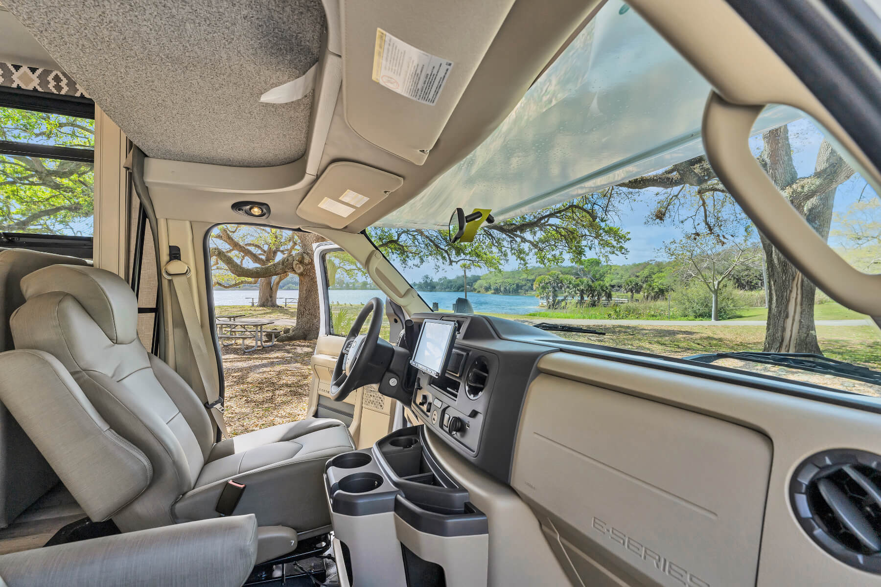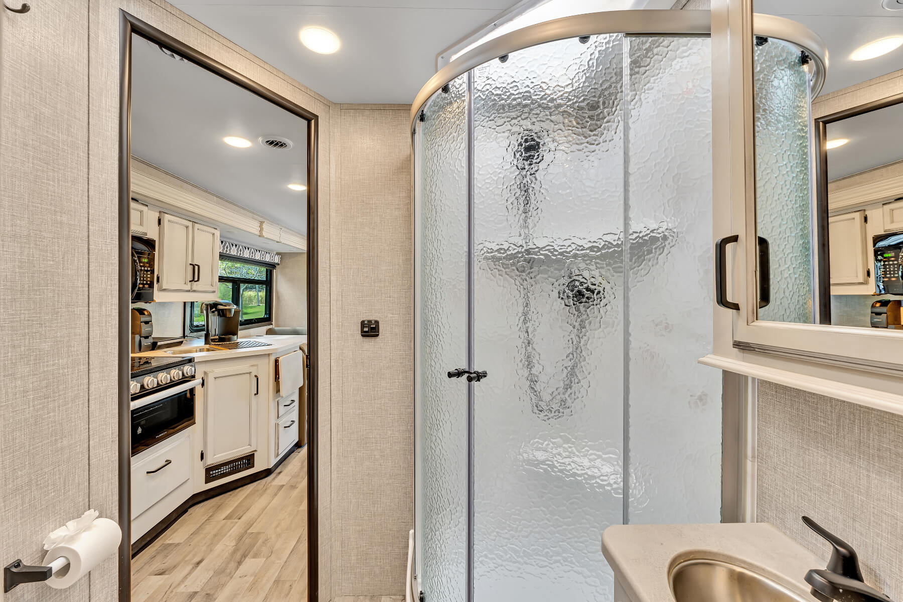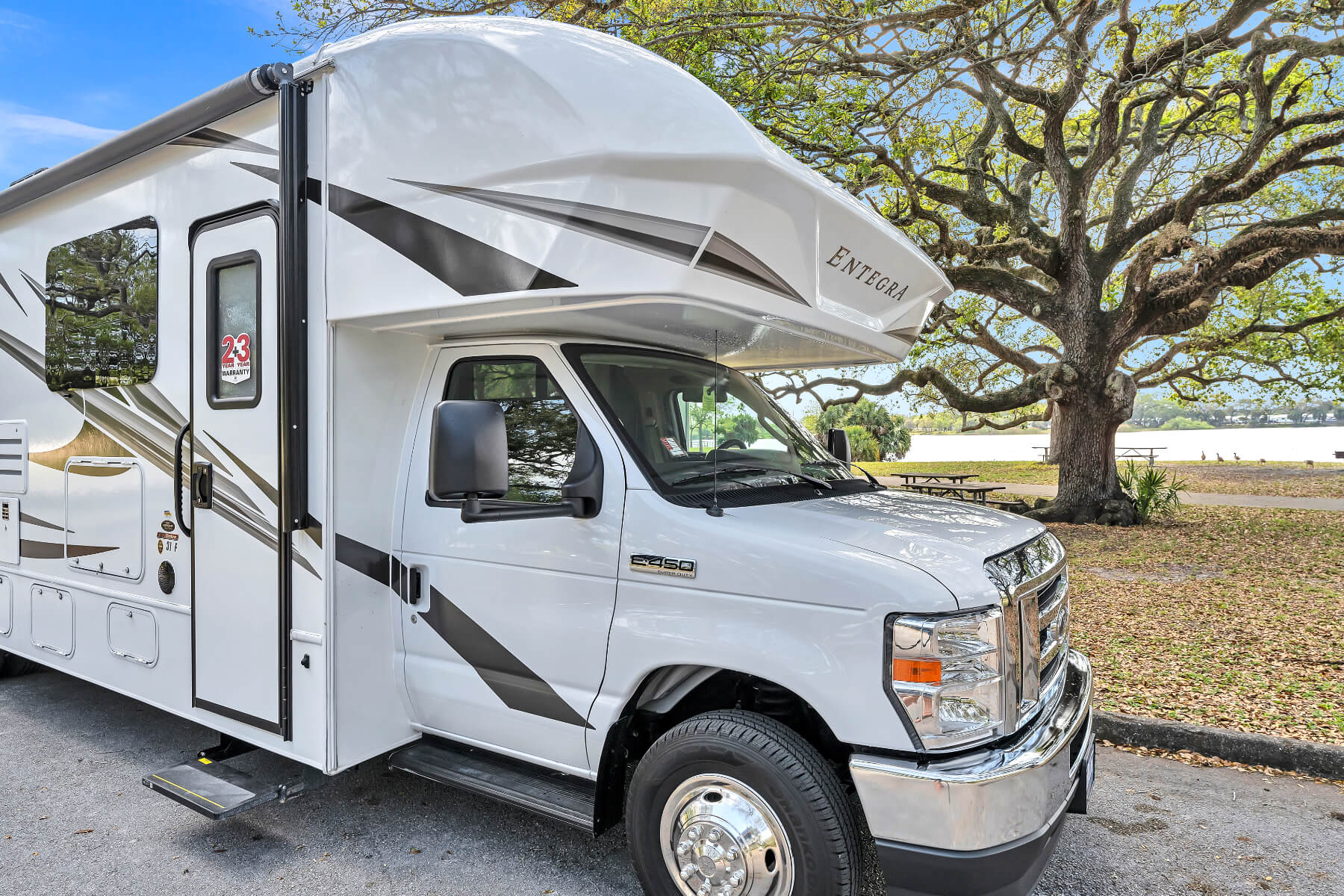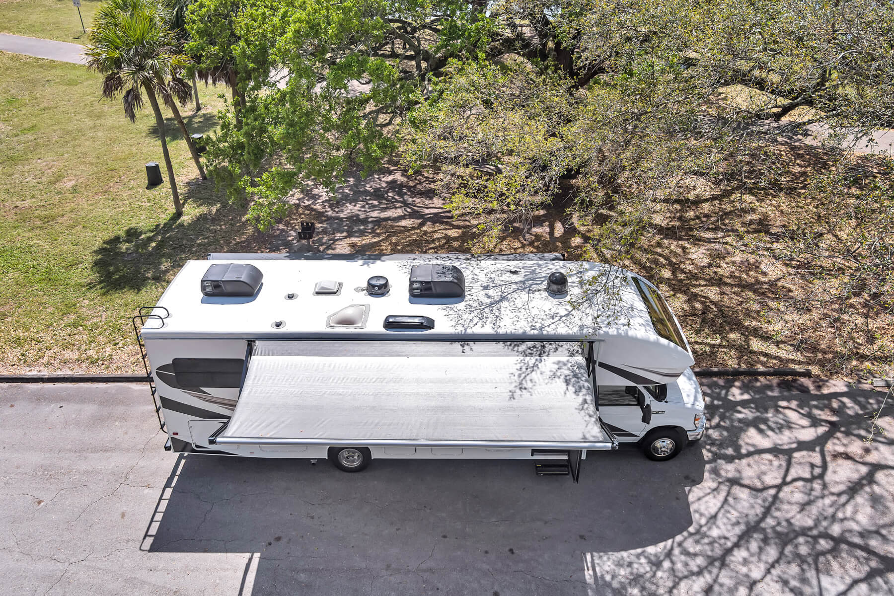 Gather your family and load up for travel games, camping games and all around comfort and luxury! The full-wall slide provides extra floor space from just behind the swivel captains chairs all the way back to the private rear bedroom with a queen bed and clothing storage. The bunk beds are across from the main entry to the bathroom, and your kids or grandkids will love this space as well as the front cab-over bunk. You even have more sleeping space provided by the booth dinette and sofa once easily setup for bedtime. And the cook will have a residential-size microwave, a Furrion all-in-one cooktop and oven, plus an 8 cu. ft. refrigerator to keep everyone fed, and the pantry will hold the snacks. Everyone can also enjoy the 18′ electric awning while at the campsite either day or night thanks to the LED lights, and the exterior TV will allow you to watch the big game in the great outdoors.